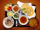 お赤飯(胡麻塩)、味噌汁(豆腐、なめこ、三つ葉)、天ぷら盛合せ(天つゆ、さつま芋、かぼちゃ、ピーマン、オクラ、茄子、モロッコインゲン、竹輪いそべ揚げ)、金平ごぼう、厚焼きたまご、酢の物(キュウリ、ワカメ、カニカマ)、フルーツ:メロン、イチゴ、生パイナップル |
