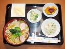 煮込みうどん(細うどん、豚肉、あげ、白菜、人参、椎茸、しめじ、長ネギ、小松菜、なると)、かぼちゃいとこ煮(あずきがけ)、ブロッコリー胡麻ドレ和え、もやし酢物(キュウリ、竹輪、白胡麻)、フルーツ:リンゴ |
