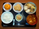 ごはん、味噌汁(玉ネギ、たまご)、すき焼き風煮(豚ロース、しいたけ、しらたき、白菜、豆腐、長ネギ)、ソフト揚げ大根おろしがけ(なめ茸)、白花いんげん豆煮、フルーツ:みかん |