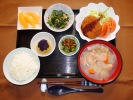 ごはん、味噌汁(白菜、椎茸、あげ)、チキンカツ(千切りキャベツ、手作りソース)、ポテトサラダ(人参、キュウリ、ロースハム、たまご)、聖護院大根と豚肉煮(大根葉添え)、大根べったら漬け、フルーツ:柿、イチゴ |