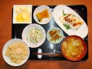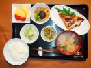 ごはん、味噌汁(玉ネギ、たまご)、ホッケ塩焼き(大根おろし)、豚肉と大根の煮物(グリンピース)、おひたし(キャベツ、人参、白すり胡麻、おかか)、ふき煮、フルーツ:黄王りんご |