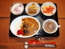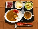 ポークカレー(豚肉、じゃがいも、人参、玉ネギ、福神漬け)、いろいろキノコのビーフスープ、コールスローサラダ(サニーレタス、キャベツ、人参、キュウリ)、玉子豆腐、フルーツ:ぶどう(レッドグローブ) |