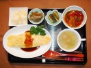 チキンオムライス(デミグラスソース、パセリ添え)、コンソメスープ(人参、セロリ、玉ネギ、じゃがいも、とうがん)、揚げシューマイ中華甘酢あんかけ、キュウリ中華炒め、ふき煮、フルーツ:リンゴ(シナノゴールド) |