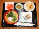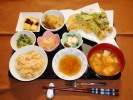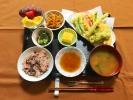たけの子ごはん(とり肉、たけのこ、あげ)、味噌汁(豆腐、しめじ、あげ、みょうが)、天ぷら(かぼちゃ、竹輪いそべ、うど、天つゆ)、小松菜の胡麻和え、たけの子とふき煮、白花いんげん豆煮、水茄子漬物、フルーツ:リンゴとレーズンコンポート |