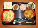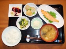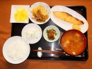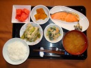 ごはん、味噌汁(豆腐、しいたけ、しめじ、長ネギ)、チリ産の塩鮭焼き(大根おろし)、竹の子とふきの煮物、ポテトサラダ(人参、キュウリ、ロースハム)、山うどたまり漬け、フルーツ:生パイナップル |