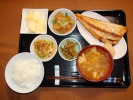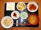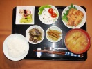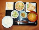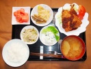 ごはん味噌汁(豆腐、あげ、椎茸、長ネギ)、チキンフライ(千切りキャベツ、ミニトマト、ソース)、酢の物(もやし、キュウリ、竹輪、すり胡麻)、ふきと竹の子の煮物、厚焼きたまご、フルーツ:リンゴコンポート(レーズン入り) |