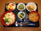 親子丼、(とり肉、玉ネギ、なると、たまご、三つ葉)、味噌汁(白菜、しめじ、あげ)、たけのことふき煮、ほうれん草・大根おろしなめ茸和え、中華キュウリ、フルーツ:杏仁豆腐(生パイナップル、イチゴ、黄桃缶) |