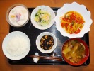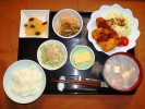 ごはん、味噌汁(白菜、しめじ)、カラスがれいの甘酢あんかけ(ピーマン、赤・黄パプリカ)、チンゲン菜とキャベツの中華炒め(カニ風味かまぼこ)、ひじきと大豆煮、フルーツ:フルーツヨーグルト(バナナ、いちご、みかん缶、白桃缶) |