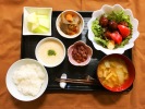 ごはん、味噌汁(白菜、しめじ、あげ)、中華ミートボール甘酢あん(サニーレタス、トマト、マヨネーズ)、こんにゃく・ごぼう・人参の炒め煮、大和芋(青のりがけ)、うづら豆煮、フルーツ:ハネージュメロン |