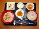 まぐろネギトロ丼(万能ネギ、わさび)、味噌汁(白菜、しめじ、あげ)、金平ごぼう、長芋(梅しそ和え)、フルーツ:ハネージュメロン(ブルーベリーソースがけ) |