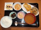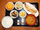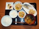 ごはん、味噌汁(白菜、なめこ)、アジフライ(千切りキャベツ、トマト、特製ソース)、うの花(人参、あげ、竹輪、しいたけ、大根葉、長ネギ、たまご)、ごぼうサラダ、もずく酢(キュウリ)、フルーツ:日向サマーオレンジ |