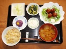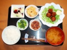 ごはん、味噌汁(白菜、しめじ、あげ)、中華ミートボール甘酢あんかけ(水菜、マヨネーズ)、竹の子の土佐煮、うづら豆煮、のらぼう辛子和え、フルーツ:ハネージュメロン(ブルーベリーソースがけ) |