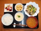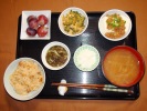 竹の子ごはん(とり肉、あげ、万能ネギ)、味噌汁(大根、しめじ、あげ)、豚肉と茄子炒め(しょうが、しいたけ、サニーレタス)、ごぼうサラダ、玉子豆腐(万能ネギ)、長芋と梅しそ和え、フルーツ:ぶどう(レッドグローブ) |