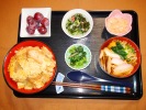 カツ丼(豚ロース、玉ネギ、たまご)、そうめん汁(椎茸、ほうれん草、紅かまぼこ、万能ネギ)、ほうれん草のなめ茸和え、酢物(キュウリ、ワカメ、カニカマ)、白花のいんげん豆煮、フルーツ:ぶどう(レッドグローブ) |