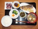 ごはん、味噌汁(豆腐、あげ、ワカメ、長ネギ)、さば塩焼き(大根おろし)、かぼちゃいとこ煮、もずく酢(キュウリ)、ほうれん草のなめ茸和えと煮たまご、フルーツ:ぶどう(レッドグローブ) |