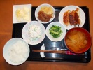 ごはん、味噌汁(白菜、あげ、なめこ)、鶏肉の立田揚げ、切干大根・昆布・人参和え、白花のいんげん豆煮、ひじき煮、白菜とひき肉の炒め煮、フルーツ:バナナ(ブルーベリーソースがけ) |