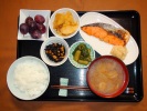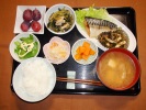 ごはん、味噌汁(玉ネギ、かぶ、しめじ、あげ)、鮭(チリ産)の塩焼き(大根おろし添え)、竹の子煮物、ひじきと大豆煮、キュウリ中華炒め、フルーツ:ぶどう(レッドグローブ) |
