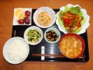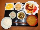 ごはん、味噌汁(玉ネギ、たまご)、揚げシューマイ甘酢あんかけ(サニーレタス添え)、竹の子土佐煮、小松菜とあげの炒め物、大豆とひじき煮(人参、あげ)、フルーツ:ぶどう(レッドグローブ、日向サマーオレンジ) |