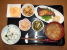 ごはん、味噌汁(あげ、ワカメ、長ネギ)、ぶりの磯辺焼き、ポテトサラダ、厚揚げとふきの煮物、キャベツの土佐煮、大豆煮、フルーツ:バナナ(ブルーベリーソースがけ) |