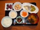 ごはん、味噌汁(豆腐、あげ、わかめ)、ホキの青シソ焼き、ひじき煮、人参のきんぴら、マカロニサラダ、里芋のカニ風あんかけ、フルーツ:ぶどう(レッドグローブ) |