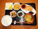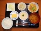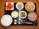 ごはん、味噌汁(玉ネギ、ワカメ、あげ)、メンチカツ(キムチゴボウ・伊豆の昆布)、ひじき煮、野菜の胡麻和え、鶏肉と野菜の中華炒め、フルーツ:リンゴ・ぶどう(クリムゾン・シードレ) |