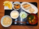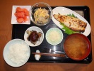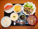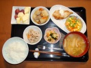 ごはん、味噌汁(白菜、あげ、なめこ)、白身魚のムニエル(ベジタブルコーン添え)、ジャガ芋と人参・椎茸煮、野菜の白胡麻和え、レンコン煮、フルーツ:リンゴ、ぶどう(レッドグローブ) |