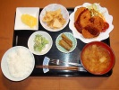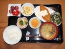 ごはん、味噌汁(いんげん、玉ネギ)、アジフライ(千切りキャベツ)、ソフト揚げ(大根おろし・なめ茸・オクラ和え)、小松菜とあげの炒め物、こんぶ煮(しょうが)、フルーツ:スイカ |