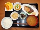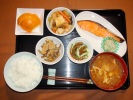 ごはん、味噌汁(玉ネギ、たまご)、チリ産鮭の塩焼き(大根おろし、甘酢しょうが、大葉)、白菜と厚揚げのうま煮(人参、しめじ)、ふきと竹の子煮(あげ)、もずく酢(キュウリ)、フルーツ:バレンシアオレンジ |