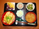 カツ丼(豚ロースカツ、玉ネギ、たまご、絹さや)、味噌汁(白菜、しめじ、なめこ)、小松菜とあげの炒め物、ごぼうサラダ、大根のべったら漬け、フルーツ:日向サマーオレンジ、ぶどう(レッドグローブ) |