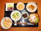 とり釜めし風ごはん、そうめん汁(紅かまぼこ、しいたけ、小松菜、万能ネギ)、あんかけしゅうまい、キャベツのおひたし中華味(ごま油、おかか)、破竹の煮物(あげ、竹輪)、ふき煮、フルーツ:ハネージュメロン、ぶどう(レッドグローブ) |