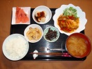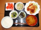 ごはん、味噌汁(あげ、豆腐、ワカメ)、白身魚のタルタルソース(ほうれん草とあげ和えの付け合せ)、ブロッコリーの煮物、竹輪とジャガイモの玉子とじ、人参とたらこ和え、フルーツ:イチゴ、ぶどう(レッドグローブ) |
