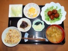 竹の子ごはん(とり肉、あげ)、味噌汁(かぶ、かぶ葉、なめこ)、ほっけ塩焼き(白花いんげん豆添え)、茄子のポン酢炒め(しめじ、人参)、大根とキュウリの梅しそ漬け、フルーツ:日向サマーオレンジ |