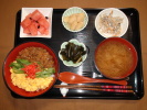 三色丼(とり挽肉、人参、いりたまご、いんげん、紅しょうが)、味噌汁(豆腐、なめこ、みょうが)、ごぼうサラダ、白花いんげん豆煮、こんぶ煮(千切りしょうが)、フルーツ:スイカ |