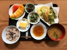 お赤飯(ごま塩)、味噌汁(豆腐、なめこ、三つ葉)、天ぷら盛合せ(さつま芋、かぼちゃ、ナス、ピーマン、パプリカ赤、いんげん、竹輪)、酢の物(キュウリ、ワカメ、カニカマ)、厚焼きたまご、ふき煮、フルーツ:メロン、スイカ |