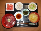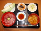 まぐろ丼(刻みのり、キュウリワサビのせ)、味噌汁(白菜、なめこ、あげ)、根菜煮物(ごぼう、人参、レンコン、しいたけ)、たまご豆腐(グリンピース、みょうが)、フルーツ:メロン |