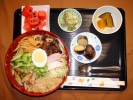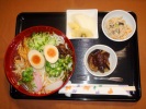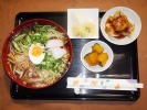 冷しうどん(細うどん)、キュウリ、オクラ、カイワレ、煮あげ、煮しいたけ、あげ玉、紅かまぼこ、みょうが、万能ネギ、ゆで玉子)、茄子胡麻味噌田楽、うの花(人参、あげ、椎茸、竹輪、さつま揚げ、たまご、グリーンピース、長ネギ)、フルーツ:梨(豊水)、ゴールデンキュウイ |