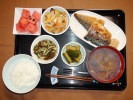 ごはん、味噌汁(茄子、あげ、みょうが)、鯖の塩焼き(大根おろし添え)、野菜たまごとじ(人参、玉ネギ、キャベツ、椎茸、あふ、たまご)、もずく酢(キュウリ)、キュウリ中華炒め、フルーツ:スイカ |