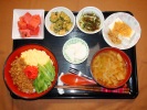 三色丼(とりそぼろ、いりたまご、いんげん、紅生姜)、味噌汁(白菜、しめじ、あげ)、ゴーヤ炒め(豚肉、たまご)、もずく酢(キュウリ)、冷奴なめ茸がけ、長芋梅しそ漬け、フルーツ:スイカ |