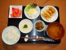 麦ごはん、味噌汁(大根、あげ)、揚げギョーザ(特製たれ)、ポテトサラダ(キュウリ、人参、ロースハム、ゆで玉子、サニーレタス)、山芋すりおろし(青のり)、こんやく煮、フルーツ:スイカ |