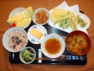 お赤飯(ごま塩)、味噌汁(豆腐、なめこ、三つ葉)、天ぷら盛合せ(天つゆ、さつま芋、かぼちゃ、ナス、れんこん、ピーマン、アスパラ、いんげん、竹輪いそべ)、金平ごぼう、酢の物(キュウリ、ワカメ、カニカマ)、厚焼きたまご、フルーツ:メロン、生パイナップル、サクランボ |