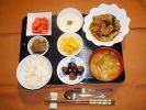 ごはん、味噌汁(大根、あげ)、すき焼き風煮(豚肉、しらたき、椎茸、しめじ、白菜、長ネギ、豆腐)、とうがんあんかけ(カニカマ、枝豆)、ゴーヤ炒め(豚肉、たまご)、もずく酢(キュウリ)、フルーツ:梨(豊水) |