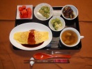 チキンオムライス(特製デミグラスソース)、いろいろキノコのコンソメスープ、ブロッコリー胡麻ドレ和え、茄子胡麻味噌田楽、豆腐なめ茸オクラがけ、フルーツ:スイカ |