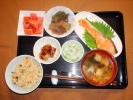 八目ごはん、味噌汁(おふ、ワカメ、長ネギ)、鮭の塩焼き(大葉添え)、とうがん焼肉風肉巻(豚バラ肉)、大根おろし(オクラ添え)、ししとう煮・こんにゃく煮、フルーツ:スイカ |