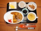 茄子ポークカレー(豚肉、揚げ茄子、玉ネギ、人参、ジャガイモ、福神漬け)、色々キノコととうがんコンソメスープ、ごぼうサラダ、とうがんの豚肉巻(生姜風味)、黒豆煮、フルーツ:梨(豊水)、生パイナップル |