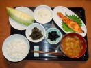 むぎごはん、味噌汁(白菜、なめこ、あげ)、チリ産鮭の塩焼き(大葉添え)、とろろ芋(オクラ和え)、ししとうの佃煮、黒豆煮、フルーツ:メロン |