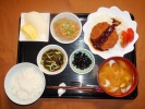 ごはん、味噌汁(豆腐、あげ、長ネギ)、メンチカツ(千切りキャベツ、トマト、特製ソース)、もずく酢(キュウリ、とうがんのあんかけ(とり挽肉、グリンピース)、黒豆煮、フルーツ:梨(豊水)、生パイナップル |