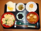 親子丼(とりもも肉、玉ネギ、たまご、三つ葉)、味噌汁(ワカメ、豆腐、みょうが)、キュウリ中華炒め、黒豆煮、フルーツ:梨(豊水)、オレンジ |