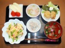 アサリごはん、味噌汁(白菜、椎茸、あげ)、揚げシューマイ甘酢あんかけ(パプリカ赤・黄、ピーマン)、大根胡麻味噌田楽(大根葉)、ごぼうサラダ、水菜おひたし(おかかがけ)、フルーツ:リンゴ、キュウイ |