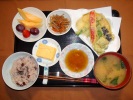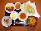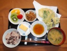 お赤飯(胡麻塩)、味噌汁(なめこ、豆腐、三つ葉)、天ぷら盛合せ(天つゆ、さつま芋、かぼちゃ、ピーマン、ナス、アスパラ、ブロッコリー、オクラ、竹輪いそべ)、金平ごぼう(白胡麻)、厚焼きたまご、フルーツ:イチゴ、キュウイ、バレンシアオレンジ |