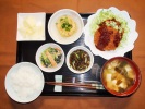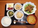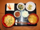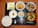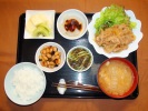 ごはん、味噌汁(白菜、あげ)、豚肉の生姜焼き(サニーレタス添え)、大根の胡麻味噌田楽、もずく酢(キュウリ)、大豆五目煮(こんぶ、こんにゃく、人参)、フルーツ:リンゴ、キュウイフルーツ |